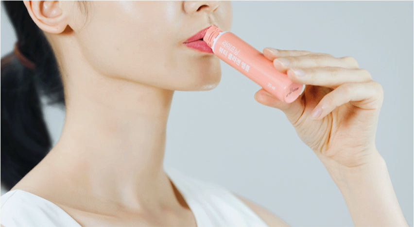 Water, Sweetener, Pomegranate concentrate, Natural pomegranate flavor (alcohol, water, natural flavor, pomegranate concentrate), DL- Malic acid, Corn starch, Vitamin C (as Ascorbic acid), Vege Juice Radish Concentrate, Apple Concentrate, Blackcurrant Concentrate, Citric acid, Water, Sodium citrate, Enzymatically modified, Stevia glucosyl stevia, Asiatic pennywort (Centella asiatica) leaf extract, Sevenberry Juice concentrate (Blackberry, Ribes nigrum L, Blueberry, Strawberry, Raspberry, cranberry, euterpe oleracea fruit juice concentrates), Hyaluronic acid mixture (dextrin, Hyaluronic acid), Wheat ceramides powder, Elastin, Hibiscus (Hibiscus sabdariffa) extract powder, Organic sea buckthorn juice, Biotin (as D Biotin) CONTAINS : Fish (Nile tilapia), Wheat